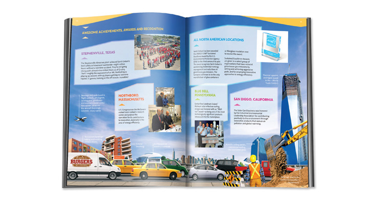 My challenge was to re-examine the traditional corporate employee annual report and reinvent this internal publication to create a more user-friendly, upbeat, digestible piece to increase readership and employee understanding of what Saint-Gobain in the U.S. and Canada does as a company. From an online feedback survey conducted after its release in 2013, reader comments received has proven my creative approach and execution did just that! Custom photo composites were created for each spread to visually tell the story of a person's journey throughout the course of a day and where Saint-Gobain products have touched their life. This project received a GOLD Hermes Creative Award in the Publications/Annual Report category for 2014.